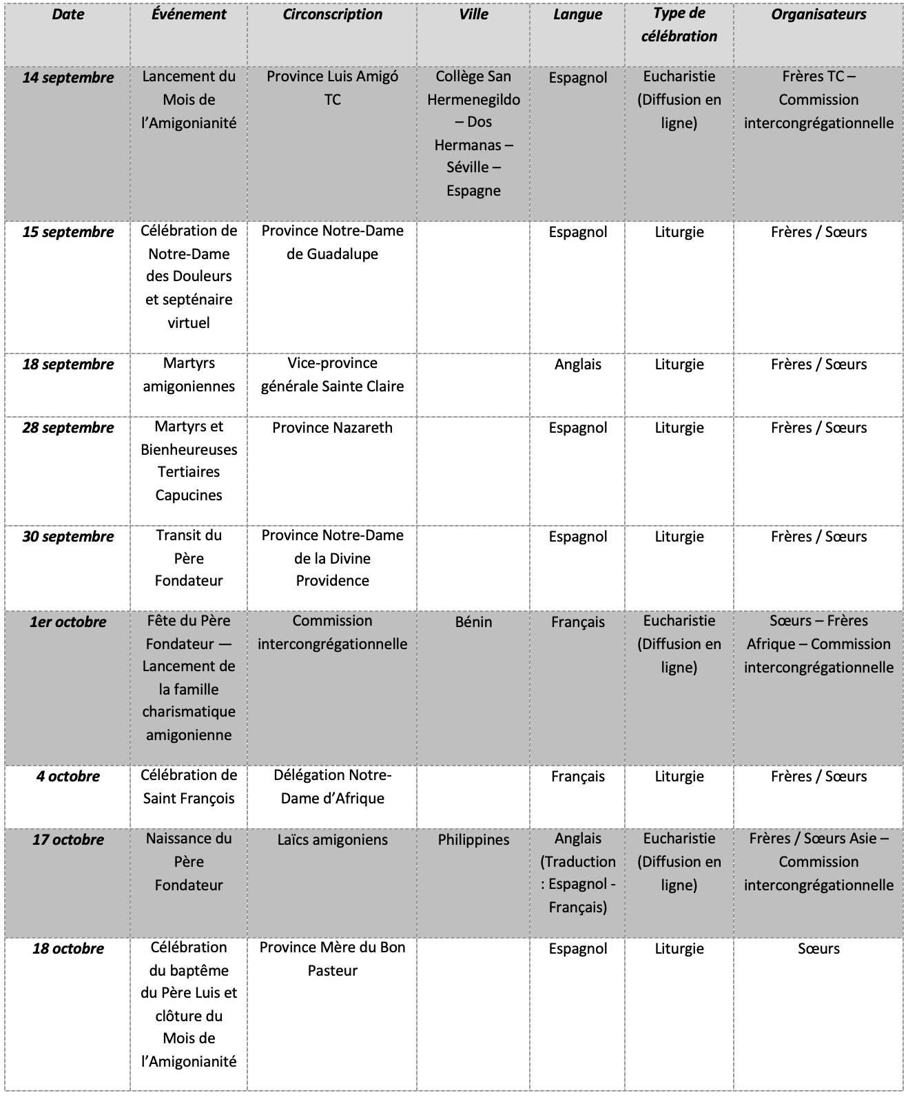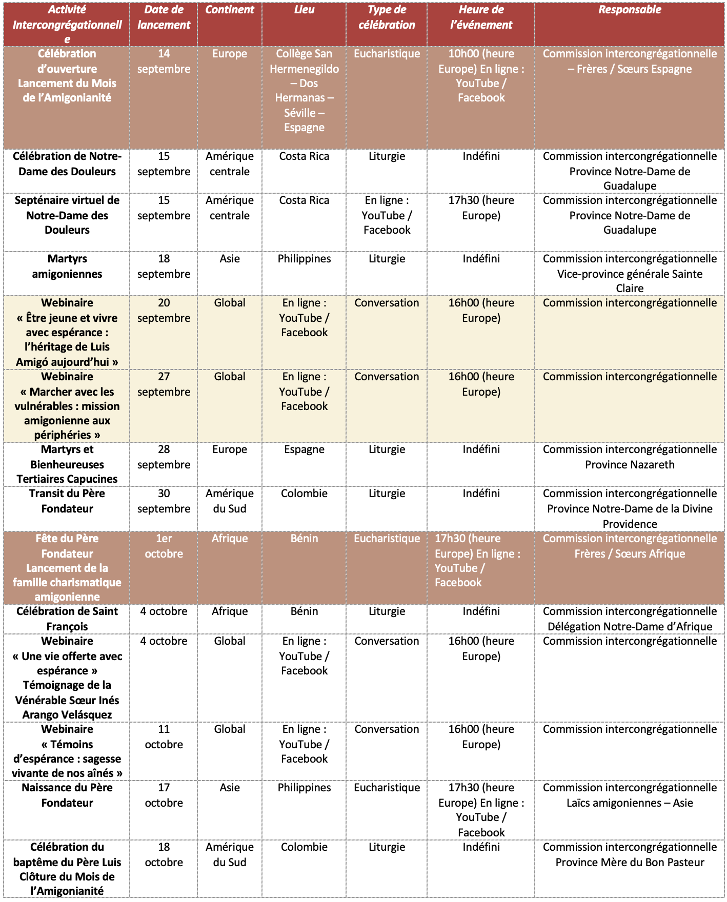 CALENDRIER DES ACTIVITÉS INTERCONGRÉGATIONNELLES – MOIS DE L’AMIGONIANNITÉ 2025
